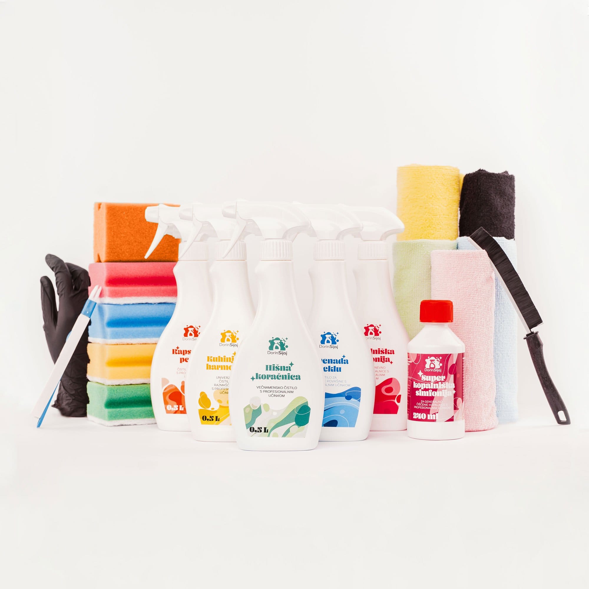 Kombinacija vseh čistil in pripomočkov, ki jih potrebujete za popolno čistočo doma
