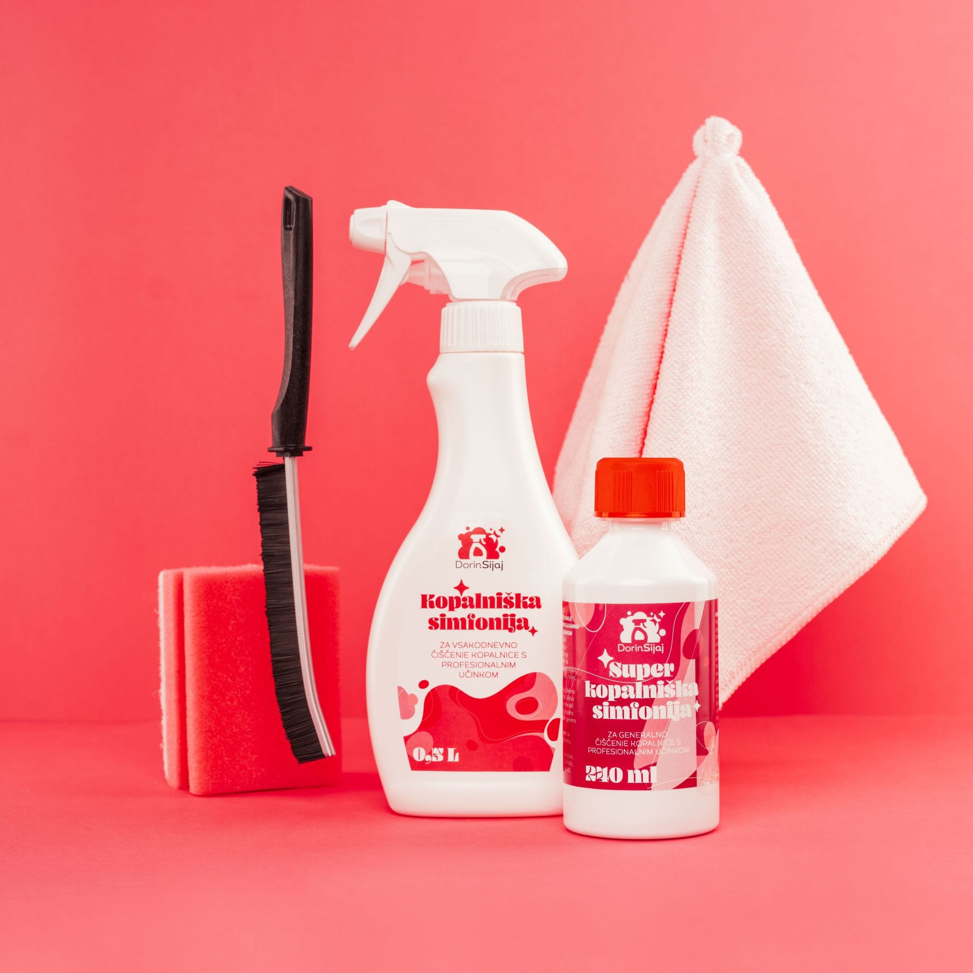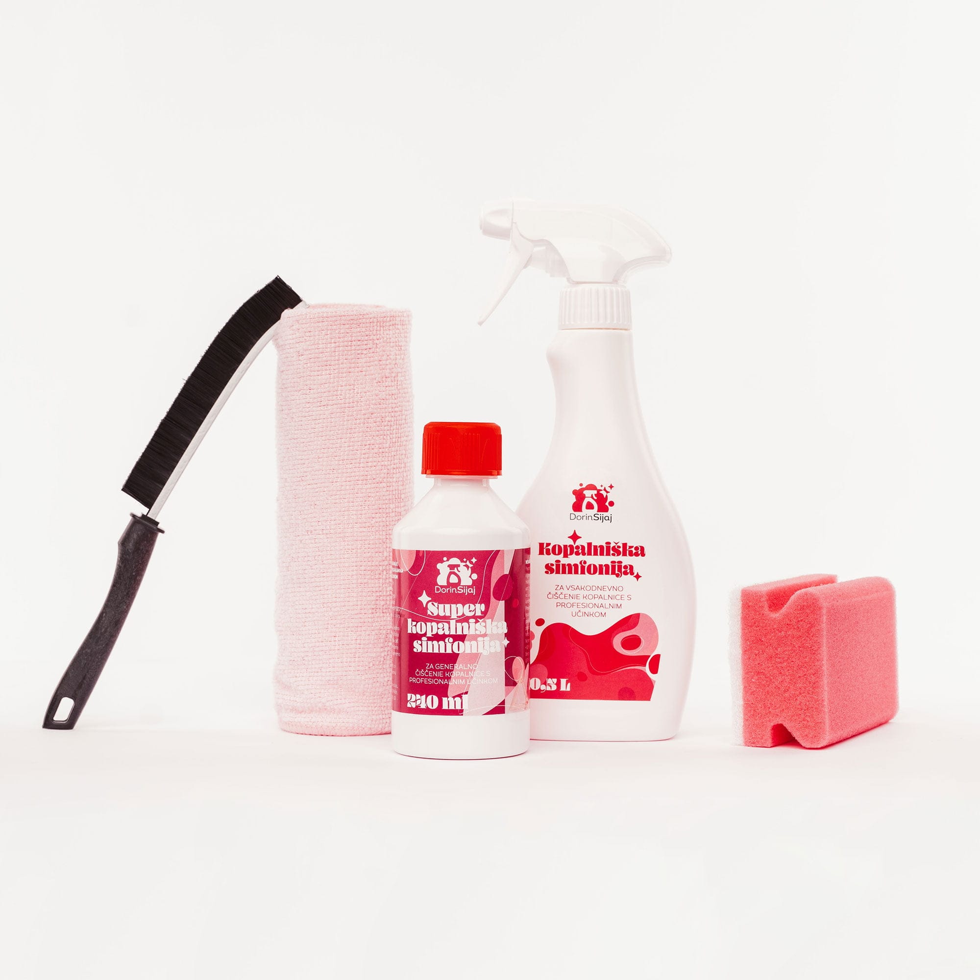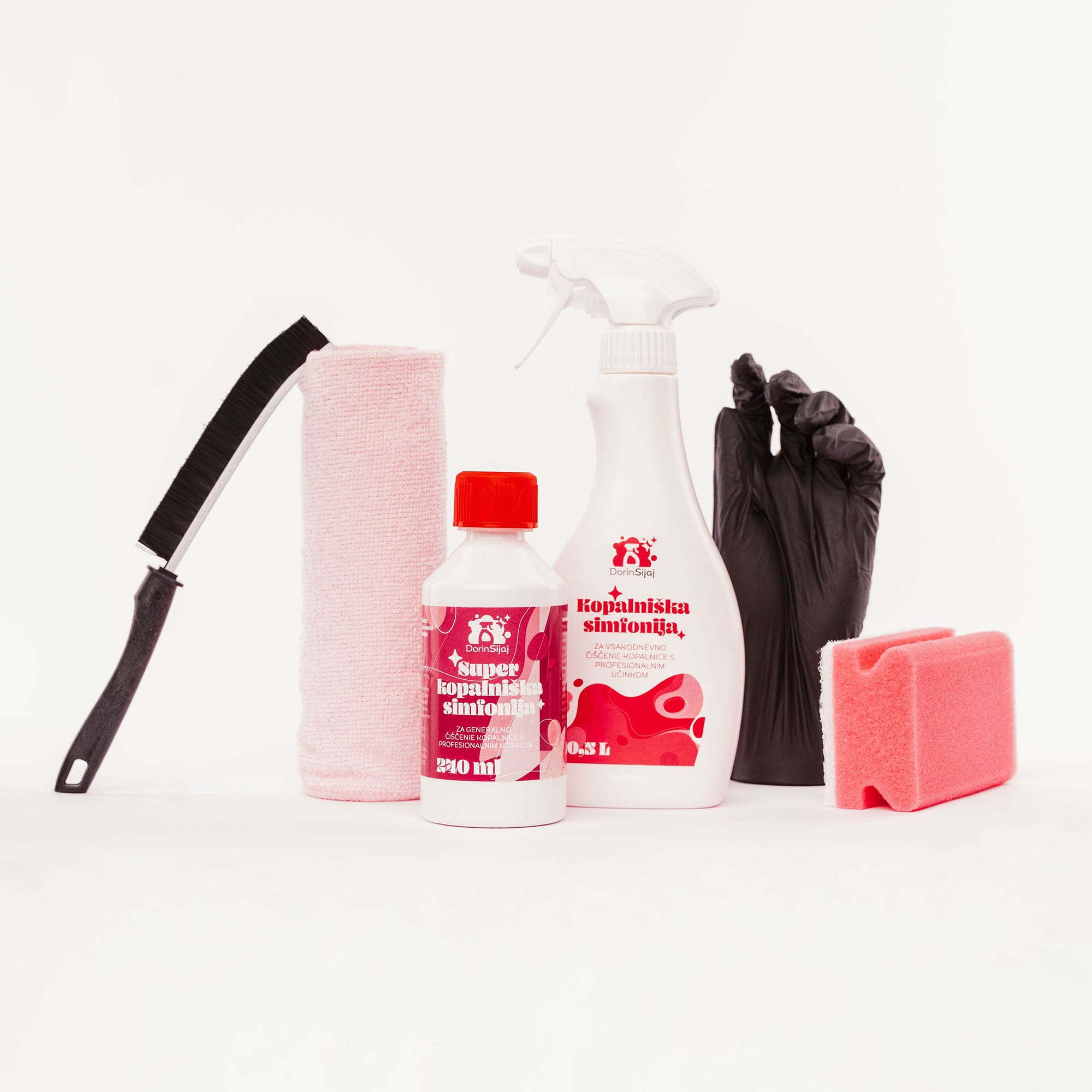 Priloženi pripomočki – roza gobica z belo kopreno, mikro krpica, ščetka in rokavice – olajšajo delo in poskrbijo za natančno čiščenje brez prask in lis. Rezultat je vedno sijoča kopalnica, brez truda in pretirane porabe časa.