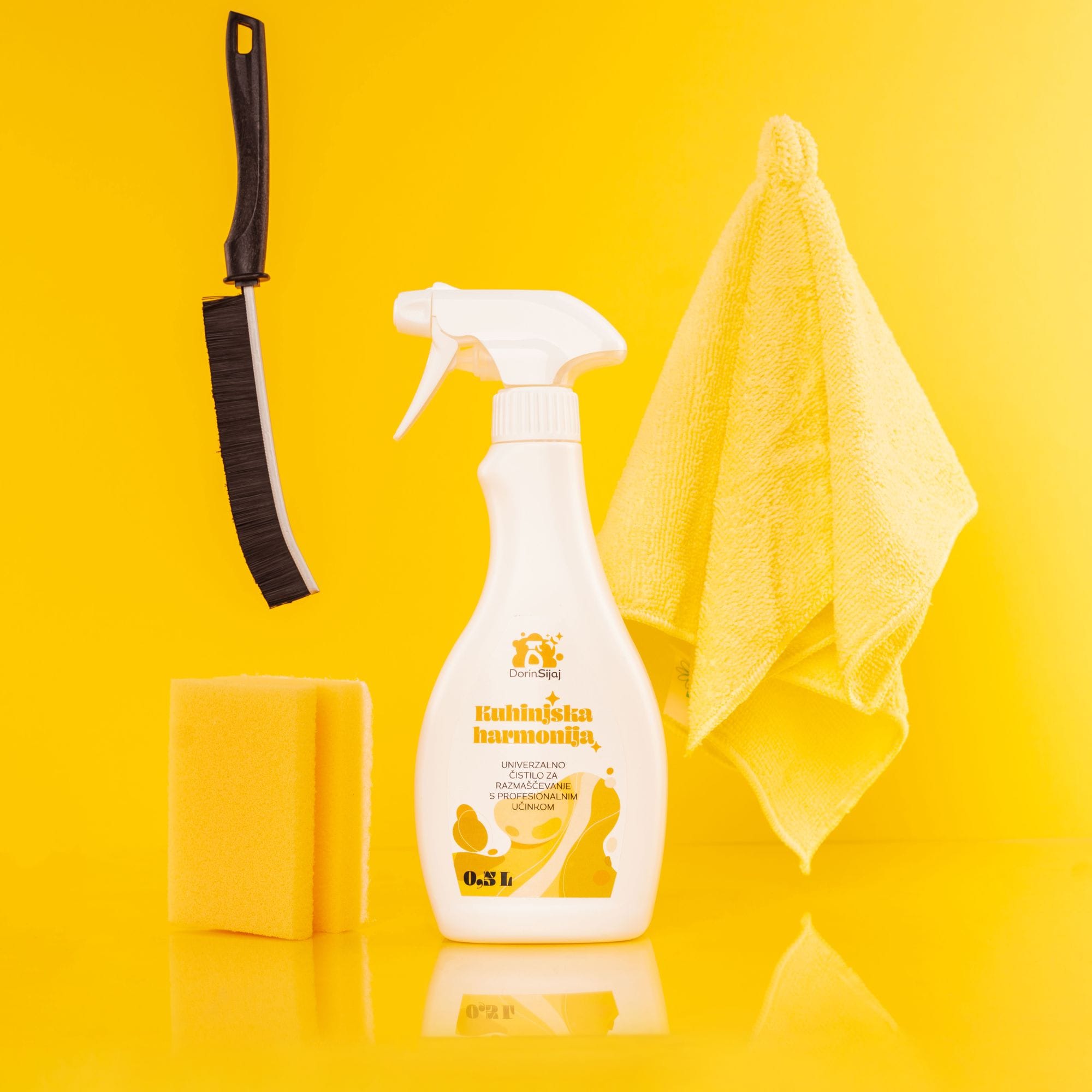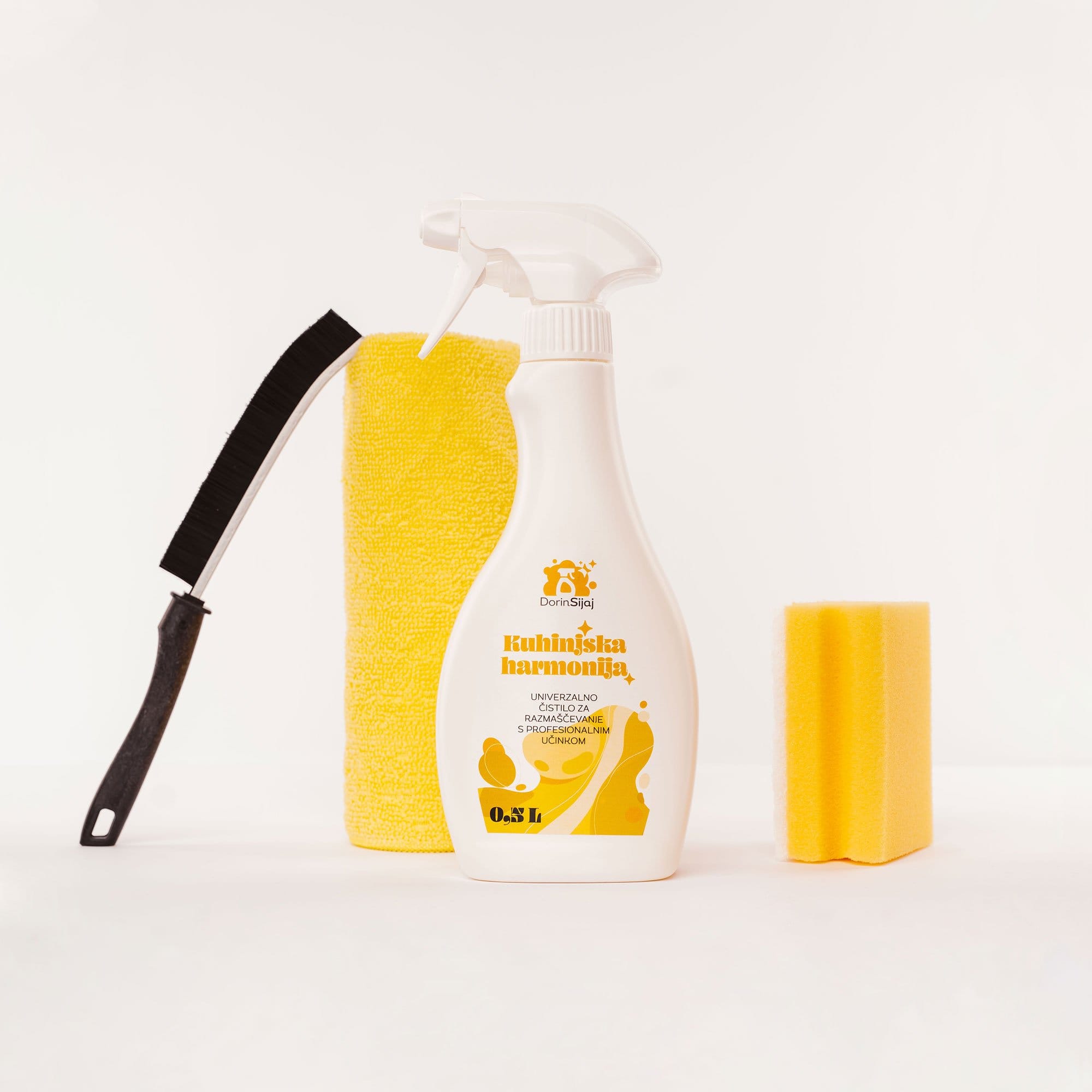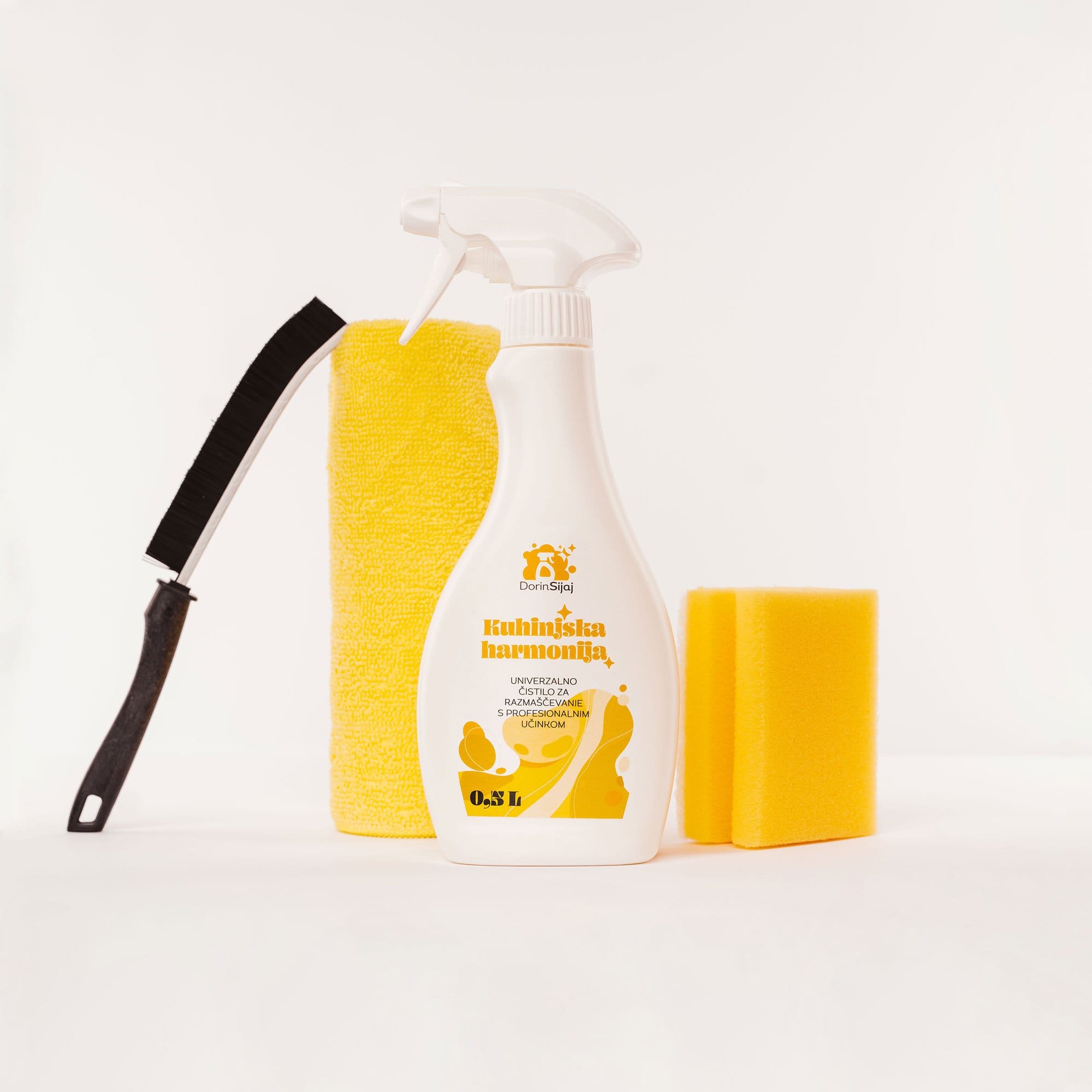 Zato smo razvili set za vsakodnevno razmaščevanje, ki združuje vse, kar potrebujete: univerzalni razmaščevalec raztopi maščobo in madeže, medtem ko priloženi pripomočki – gobica, mikro krpica, ščetka in rokavice – poskrbijo, da čiščenje poteka natančno, varno in brez napora.